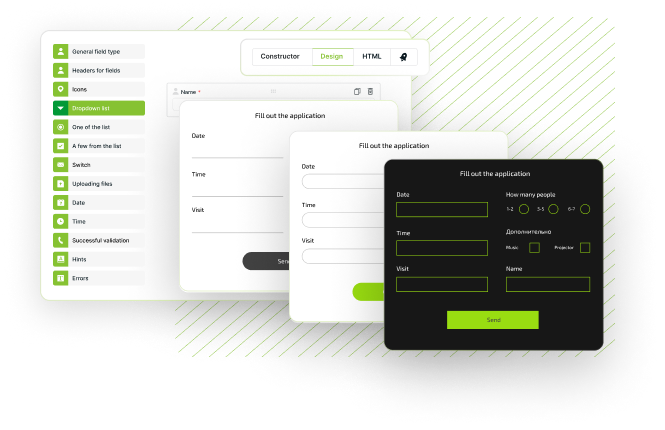 The functionality of the service will allow you to quickly create and customize feedback for the desired goals. The toolbar contains all the necessary elements and types of form fields: text and numeric strings, date and time selection, drop-down lists and the rest. You can use feedback forms made on the constructor without a website