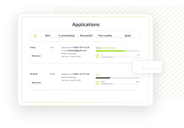 Notifications about applications are configured by mail, messengers or CRM and come in real time. It is also convenient to control managers: a notification will be sent if the request remains unanswered for too long