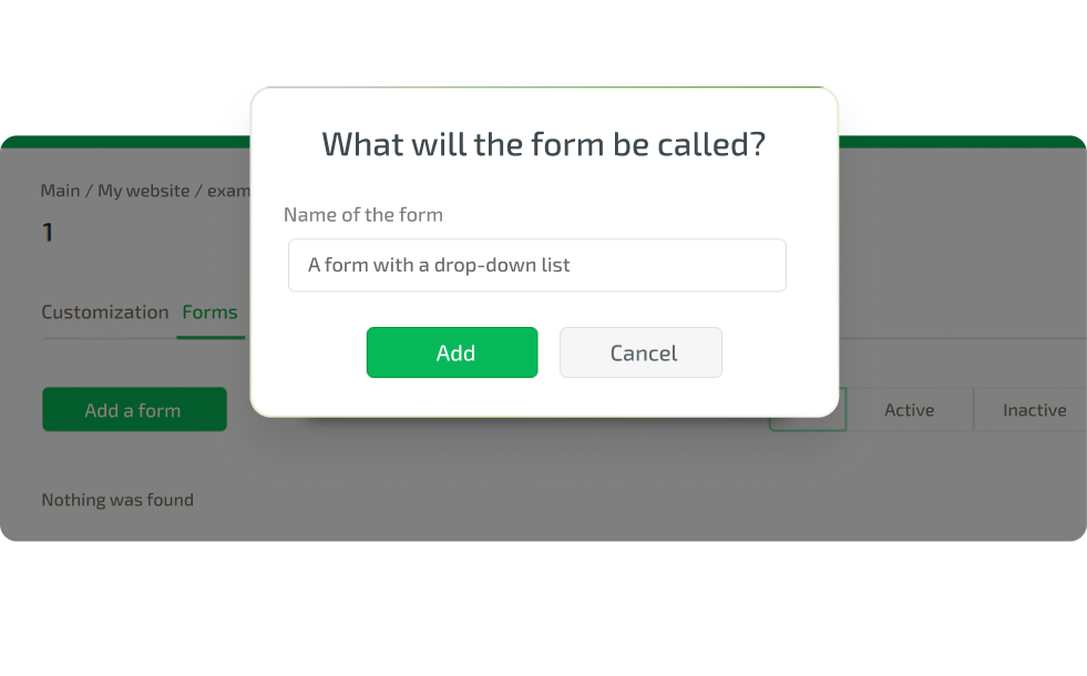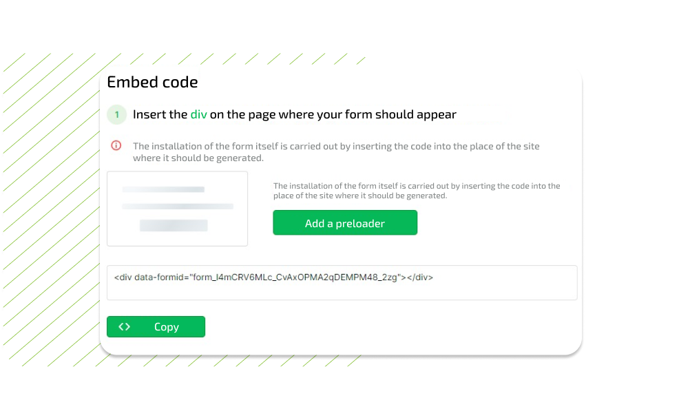 Go to the "Insert Code" tab. Copy the text from the DIV window to install the form and the script to call it, paste it on the site