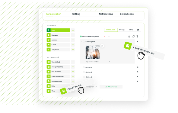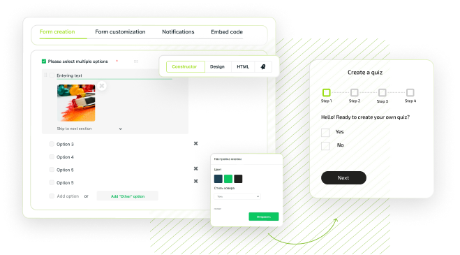 Collect quizzes from ready-made elements: checkboxes, buttons with numbers, switches, drop-down lists, text fields. Supplement your quizzes with a link, text or picture