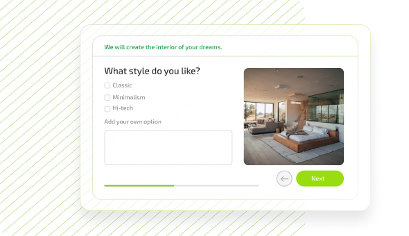 The Qform website quiz service creates an interactive form for any of your requests. The quiz is a convenient web-based tool that helps to engage the audience in interaction, make choices and study their needs. The visitor answers the questions and leaves a request with the input data