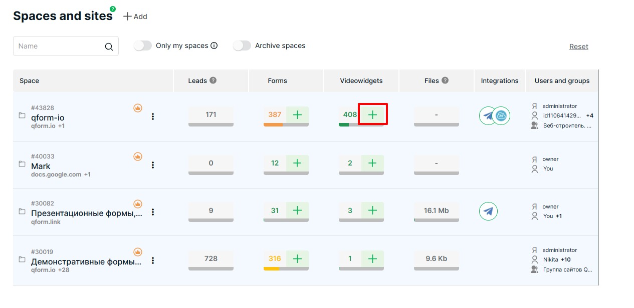 Next to the desired space, click the “+” icon in the “Video widgets” column.