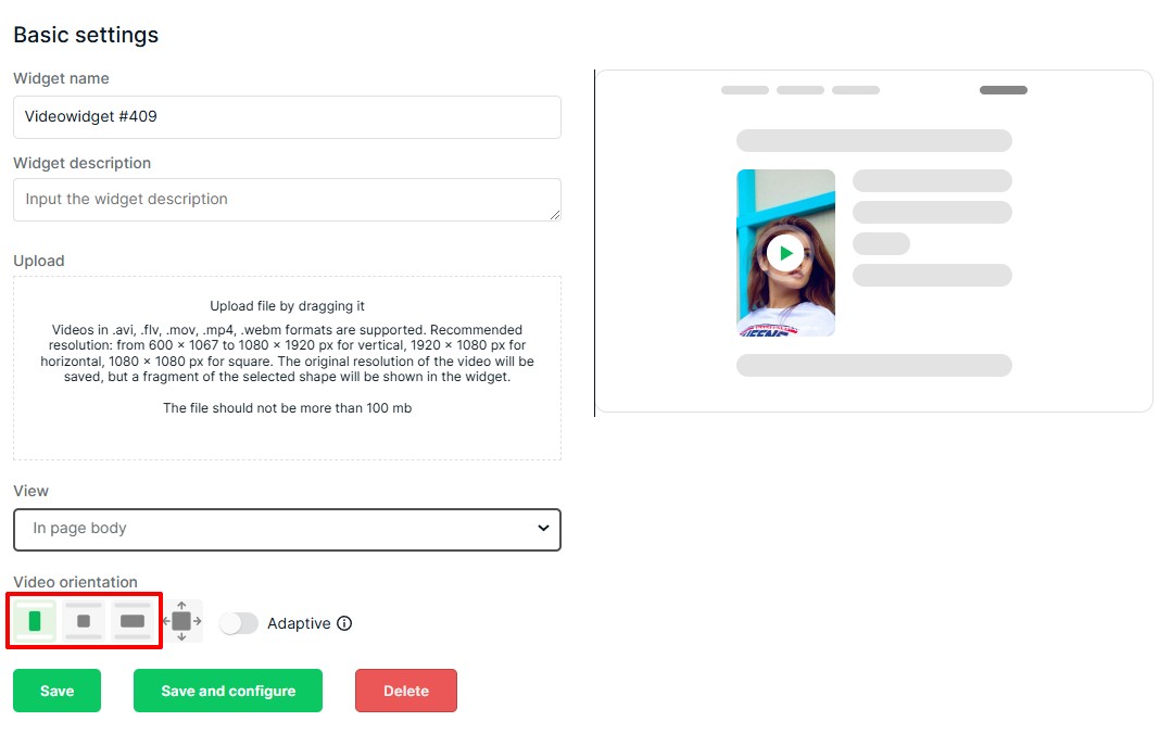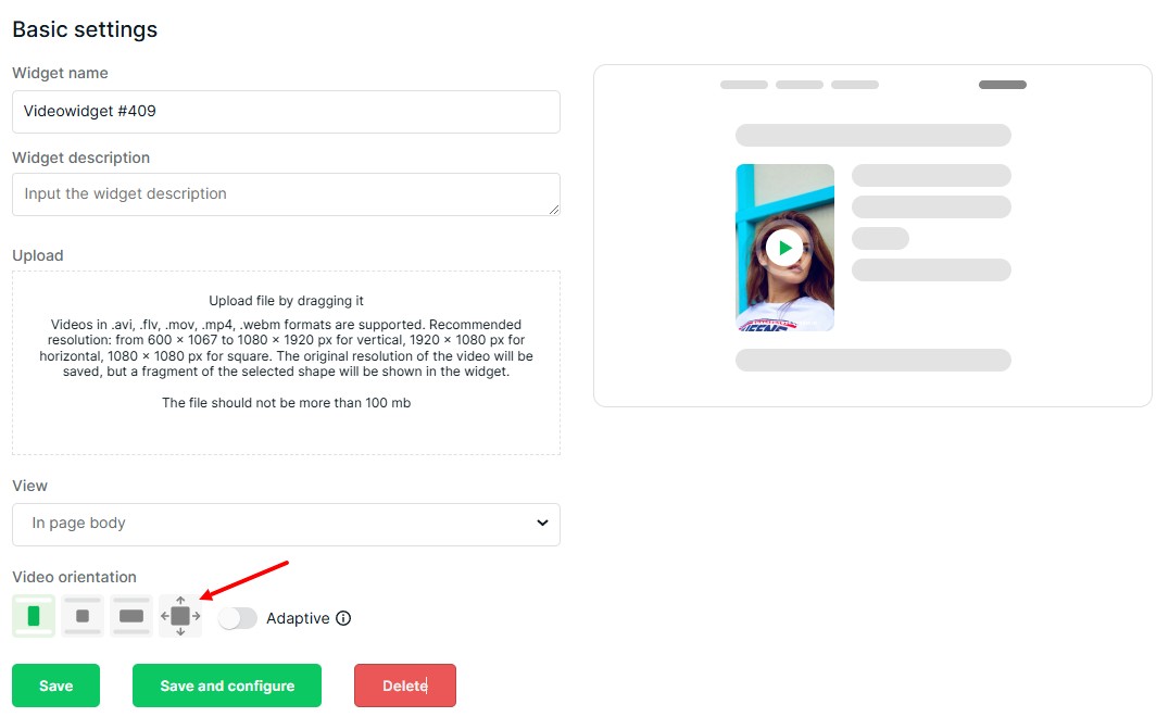 Then decide on the orientation (vertical, square, horizontal) and enable the responsive property. Then the video will fill the entire width of the parent element and maintain its proportions
